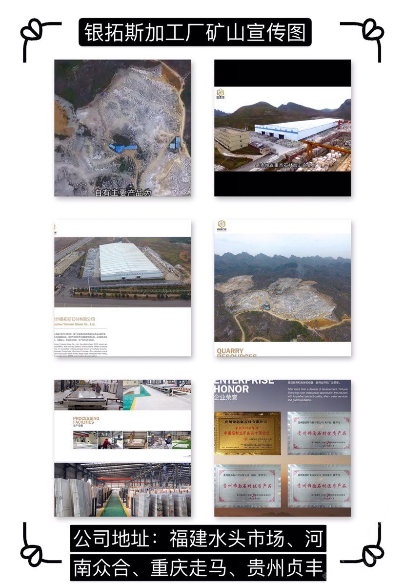 貴州銀拓斯石材有限公司成立于2012年9月,位于黔西南州貞豐縣北盤江鎮(zhèn),經(jīng)營范圍為石材開采、加工、銷售,主要加工貴州木紋、米黃等系列產(chǎn)品。貴州銀拓斯石材有限公司占地面積65.74畝。引進(jìn)國內(nèi)外先進(jìn)的石材生產(chǎn)工藝和加工設(shè)備,現(xiàn)已安裝科達(dá)靜壓鋸6臺(tái)、高效磨機(jī)1臺(tái)等設(shè)備,年產(chǎn)板材100萬平方米。公司自有木紋礦山兩處、米黃礦山兩處、新品礦山兩處,年產(chǎn)荒料5萬立方米。公司秉承“勵(lì)志創(chuàng)新、篤守誠信”的經(jīng)營理念,立足于重實(shí)際、辦實(shí)事、見實(shí)效,把文化理念融入到生產(chǎn)建設(shè)和質(zhì)量管理的各個(gè)環(huán)節(jié),致力于用文化提升領(lǐng)導(dǎo)力、執(zhí)行力和凝聚力,以文化促進(jìn)生產(chǎn)力,以軟實(shí)力提升“銀拓斯”整體發(fā)展水平,為客戶提供“高效率、高品質(zhì)、全方位”的服務(wù),不斷提升產(chǎn)品品質(zhì),程度地滿足客戶的需求。\\\\\\\