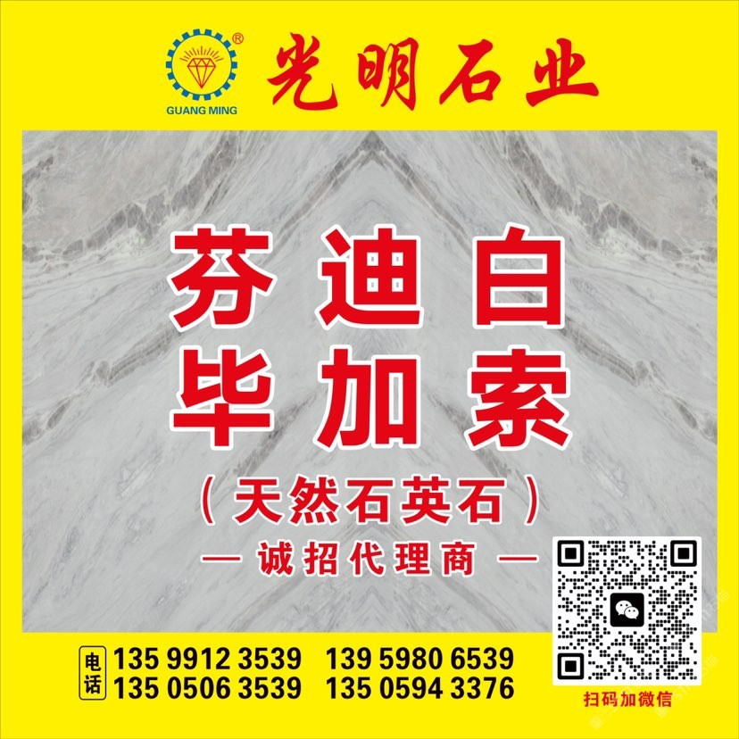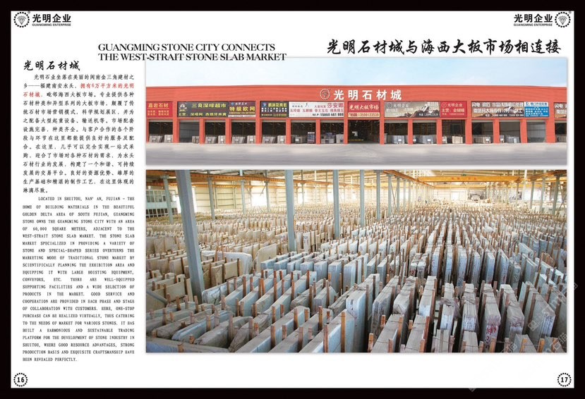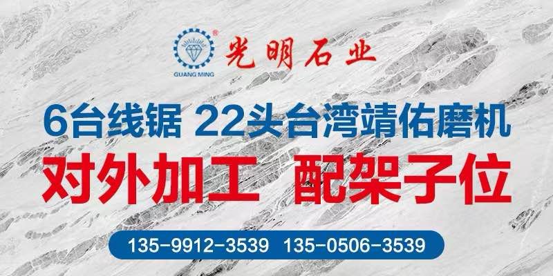 公司主要生產(chǎn)加工國(guó)內(nèi)外大理石、花崗巖、工程板、臺(tái)板、異形線條及地鋪石系列,目前擁有一系列先進(jìn)生產(chǎn)設(shè)備,具備加工優(yōu)質(zhì)石材的能力,可加工各種規(guī)格平板、弧形及異形板,承包國(guó)內(nèi)外多座大理石、花崗巖礦山,荒料庫(kù)存達(dá)數(shù)十萬(wàn)立方,大板庫(kù)存量達(dá)幾十萬(wàn)平方,可承接國(guó)內(nèi)外各種大型工程。多年來(lái)先后在北京、上海、浙江、天津、廣東、江蘇、湖北、四川、新疆、江西等地設(shè)立分公司,健全了公司的銷售網(wǎng)絡(luò),使光明的品牌深入人心,產(chǎn)品深得廣大顧客的一致好評(píng)。良好的信譽(yù)也使公司先后榮獲“文明經(jīng)營(yíng)戶”、“誠(chéng)信單位”、“明星企業(yè)”、“石材之星”、“全國(guó)質(zhì)量信得過(guò)產(chǎn)品”、“全國(guó)質(zhì)量服務(wù)消費(fèi)者滿意企業(yè)”、“守合同、重信用單位”的榮譽(yù)稱號(hào),并通過(guò)了DHSAS18001健康管理體系認(rèn)證、GB/TI9001-2000-ISO9001:2000質(zhì)量標(biāo)準(zhǔn)和ISO14001:2004環(huán)境管理體系認(rèn)證。\\\\\\\\\\\\\\\