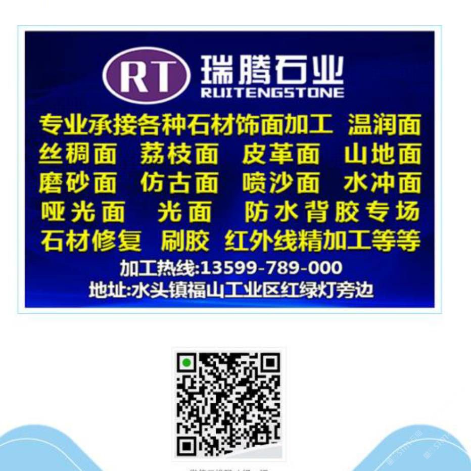 專業(yè)承接各種石材飾面加工,溫潤面,荔枝面,仿古面,剁斧面,啞光面,專業(yè)石材防水背膠等等,20頭靖佑自動(dòng)磨對(duì)外加工,聯(lián)系電話13599789000