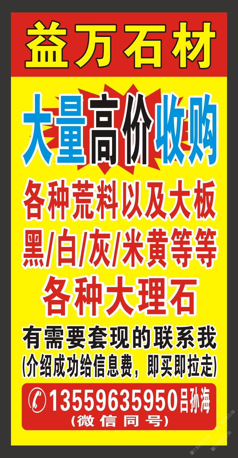 `【長期大量??高價求購】大板,荒料,多少量都可以;云多拉灰,奧特曼,白玉蘭,南斯拉夫白,溫德姆灰,星耀灰,保加利亞灰,奢石等各種大理石;需要:套現(xiàn)、清倉、換品種的速來,介紹成功給信息費,現(xiàn)收現(xiàn)拉!微信:13559635950呂孫海微信同號