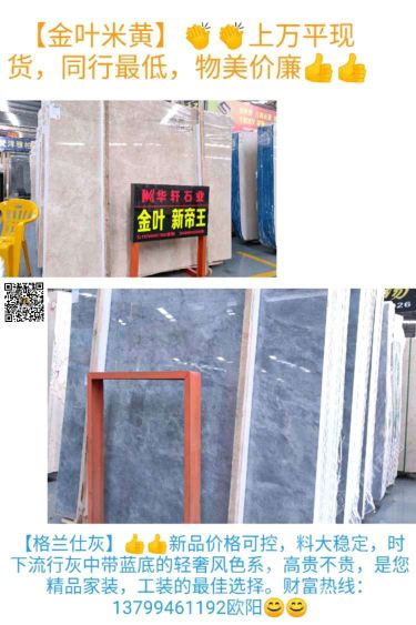 發(fā)布信息: 金葉米黃.新帝王 太空灰深藍(lán)淺藍(lán)底 新品:格蘭仕灰 價(jià)廉,物美 大量新貨.工程.家裝 銷(xiāo)售熱線:13799461192歐陽(yáng) 地址:澳盛5B棟1區(qū)【華軒石業(yè)】