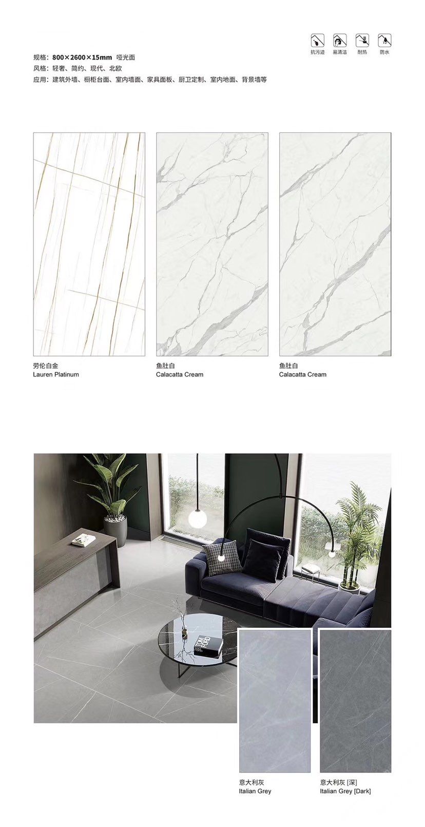 發(fā)布信息: ????SIBELAN 斯貝納巖板???? ????意大利設計師精選巖板???? 我們可以幫老總您加工為成品, 全國范圍內可安排專業(yè)團隊安裝. 做到您一次性采購 省心. 放心. 省時. 低價! 巖板紋路版面全多達199 款 勵志做服務五星的巖板專業(yè)供應商 魚肚白 雪花白 格蘭云天 寒江雪 爵士白 幻影灰 勞倫黑金 火山灰 亞馬遜 艾維拉 羅馬黑檀 貝特巖 細花白 羅馬灰 云朵拉灰 魚肚金 莎羅娜 莎羅蘭 勞倫白金 拉薩白 中花白 灰冰玉 卡拉拉白 撒金黑 清水玉 薩瓦灰 莎士比亞 大花灰 白冰玉 銀灰洞 阿瑪尼灰 綠紋玉 綠冰玉 藍紋玉 保加利亞灰 鐵銹 黑木紋 流砂灰 純白 純灰 純黑 TEL: 15905069590 聶 各種版面規(guī)格全部如下: 1200×600×11mm 啞光 1500×800×11mm 啞光 1800×900×11mm 啞光 1800×900×12mm 啞光 2600×800×15mm 啞光 2400×1200×6mm 啞光/亮光 2400×1200×9mm 啞光/亮光 2400×1200×15mm 啞光 2700×1200×6mm 啞光/亮光 2700×1600×12mm 啞光/亮光 3200×1600×6mm 啞光/亮光 3200×1600×12mm 啞光/亮光