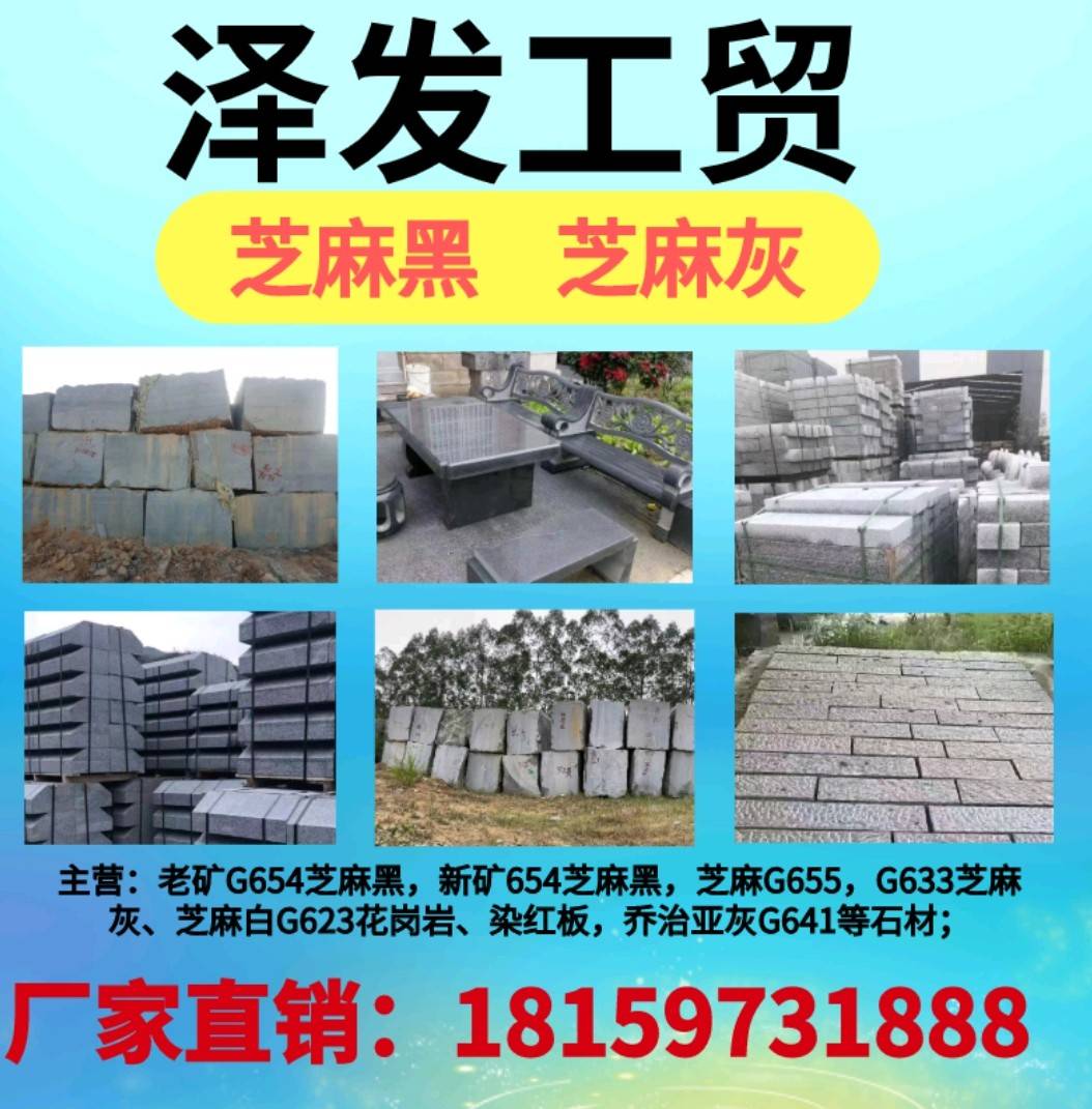 發(fā)布信息: 澤發(fā)石業(yè)王總18159731888專業(yè)新老礦芝麻黑芝麻灰供應(yīng)商,主營(yíng):老礦芝麻黑G654石材(長(zhǎng)泰縣吳田山正礦654),新礦芝麻黑G654石材(南靖654、平和654、代溪654、漳浦654、角美654),芝麻灰G655石材,喬治亞灰G641石材等光面、燒面、荔枝面、墓碑石材、地鋪石材、園林景觀工程、馬蹄石、路沿石道牙石、水溝蓋板、盲道石盲人石、臺(tái)階石廣場(chǎng)石、樹框石樹穴石樹圍石花圍石、游泳池蓋板、壓頂石欄桿石等;廠礦一體,體格優(yōu)惠,真誠(chéng)希望您的光臨與合作!