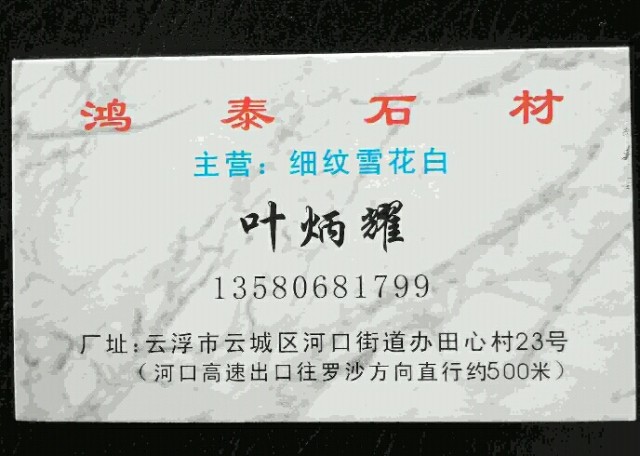 云城區(qū)鴻泰石材 聯(lián)系人:葉生    135****1799 查看 手機(jī)號碼:無 主營范圍: 大板批發(fā)、 企業(yè)地址:廣東云浮云城區(qū)河口街道辦田心村23號