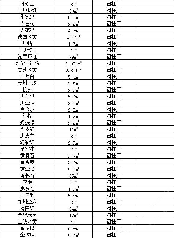 發(fā)布信息: 鴻源圓柱 ,大量荒料處理, 聯(lián)系電話:13506960182 漳浦銹石、G439#、G601#、G602#、G603#、G606#、G614#、G617#、G623#、G633#、G635#、G636#、G640#、G648#、G654#、G655#、G656#、G657#G663#、G664#、G688#、阿瑪尼、阿曼米黃、埃及米黃、安哥拉黑、奧特曼米黃、巴西金、巴西金麻、芭拉白、白玫瑰、白沙米黃、白玉蘭