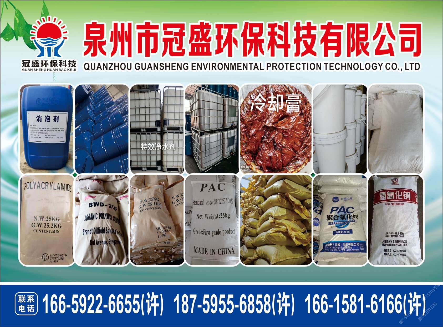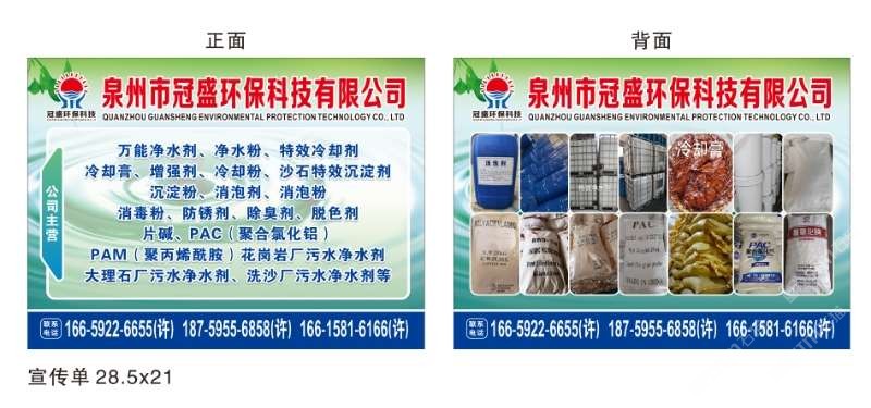 發(fā)布信息: 冠盛環(huán)保科技16615816166 主營(yíng)產(chǎn)品:凈水劑,冷卻劑,冷卻粉,大理石人造石專用凈水劑,沉淀粉,消泡劑,消毒凈水劑,防銹凈水劑,除銹劑,除臭劑,聚丙烯酰胺,聚合氯化鋁,鹵精,洗沙專用凈水劑,壓濾機(jī)專用凈水劑,陶瓷廠專用凈水劑(黃藥 白藥)等所有水處理環(huán)保材料……