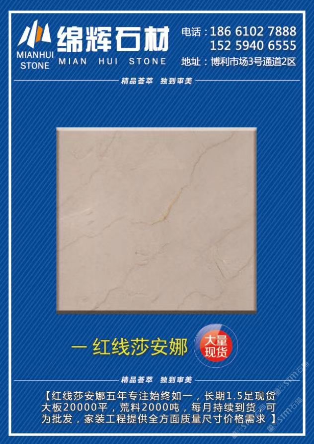 發(fā)布信息: 綿輝石材·博利3通道2區(qū)賣場(chǎng) 全場(chǎng)新貨《紅線莎安娜》1.5光板2萬(wàn)平,荒料2千噸。走量不走價(jià),總有一款適合您!可為您提供家裝/批發(fā)/工程單/全方面的價(jià)位尺寸質(zhì)量需求! 綿輝石材·石通天下E10區(qū)賣場(chǎng) 2800平《金歐典》5900平《紅線莎安娜》限量特價(jià)90元起,工程單福利,清完為止,速來(lái)?yè)炻? 咨詢熱線:13004819222李