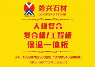 隆興復(fù)合板主營產(chǎn)品:復(fù)合板(保溫石材),復(fù)合板(大理石鋁蜂窩),復(fù)合板(大理石花崗巖復(fù)合),復(fù)合板(玉石玻璃),復(fù)合板(大理石瓷磚),復(fù)合板(超?。?復(fù)合板(奢石),透光復(fù)合板(光電奢石)企業(yè)地址:福建南安石井鎮(zhèn)蘇內(nèi)工業(yè)區(qū)8號(hào)